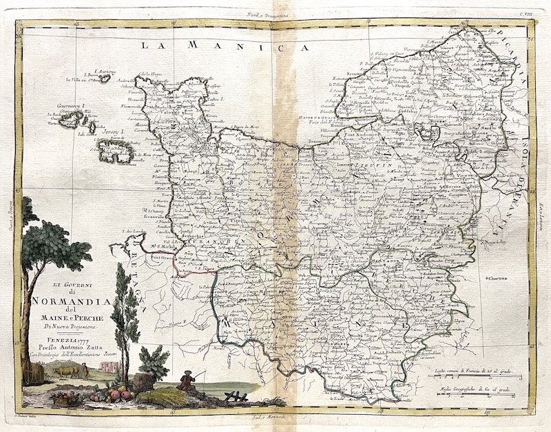 Antonio Zatta (c.1722-c.1804) fue el cartógrafo y editor italiano más destacado de su época en Venecia. Sus principales obras incluyen el mencionado "Atlante Novissimo", un atlas del mundo en cuatro volúmenes; y su gran estudio de la Basílica de San Marcos en Venecia, impreso en 1761. Sus mapas que marcan una transición importante de los estilos cartográficos del siglo XVIII al XIX, y son reconocibles por su característica redefinición de las cartelas, que sustituyen los elementos míticos por costumbristas y representativas de su época.