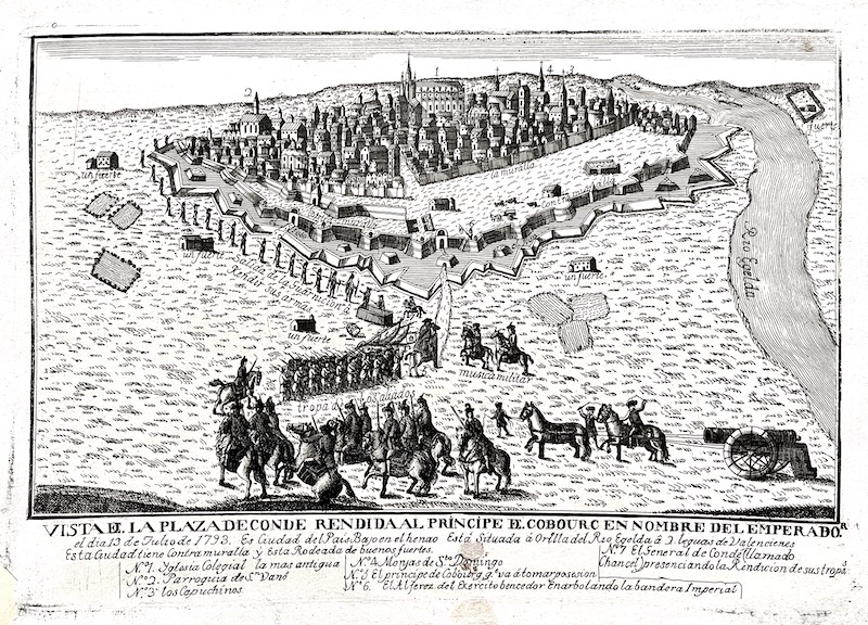 Vista de la Plaza de Conde rendida al Principe de Cobourc en nombre del Emperador el dia 13 de julio de 1793. Es ciudad del Pais Bajo en el henao. Esta situada a orillas del Rio Egelda a e leguas de Valenciennes. Esta ciudad tiene contramuralla y...