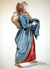 Mujer de Santander con un bebe en un capazo a la espalda